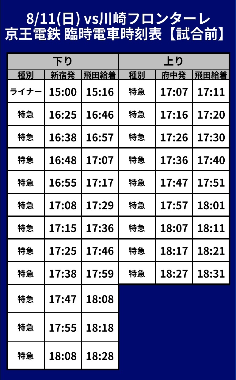 Am So., 11.08.2024, im 26. Spieltag der Meiji Yasuda J1 League gegen Kawasaki Frontale (Anpfiff 19:00 / Ajinomoto Stadium) informieren wir über den eingesetzten Sonderverkehr (Schienenverkehr), Shuttlebusse und Linienbusse.