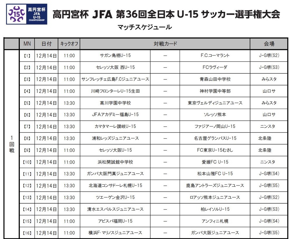 Wir möchten Sie darüber informieren, dass die Turnierübersicht für den „Kōnomiya Cup JFA 36. Alljapanische U-15 Fußballmeisterschaft“, an dem FC Tokyo U-15 Musashi teilnimmt, festgelegt wurde. Wir bitten Sie um Ihre herzliche Unterstützung für FC Tokyo U-15 Musashi.