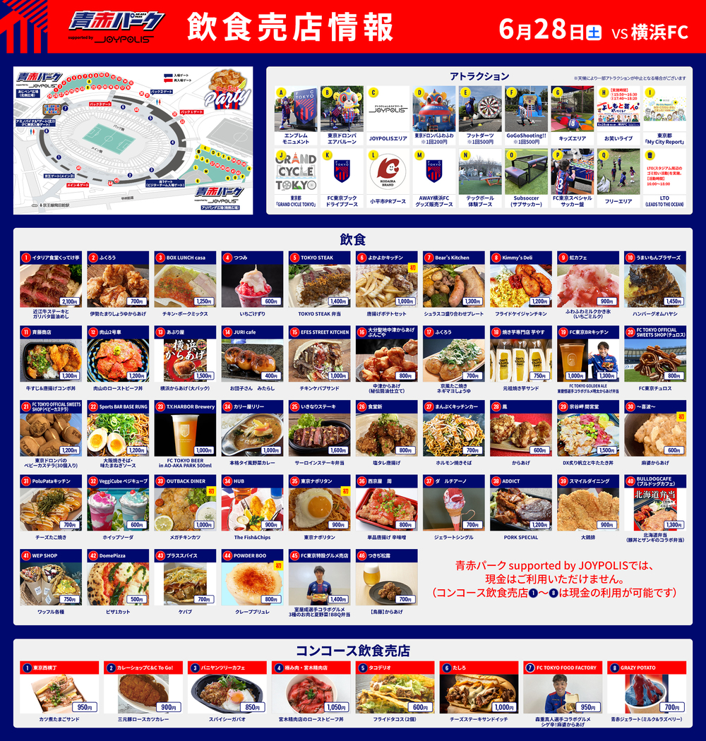 Am Sa., 28.06.2025, 22. Spieltag der Meiji Yasuda J1 League vs Yokohama FC (Anpfiff 19:00 / Ajinomoto Stadium), informieren wir Sie über Speiseangebote im AO-AKA PARK supported by JOYPOLIS (außerhalb des Stadions), dem mobilen AO-AKA PARK supported by JOYPOLIS sowie an den Verkaufsständen im Innenbereich des Stadions (Konzessionsgänge).