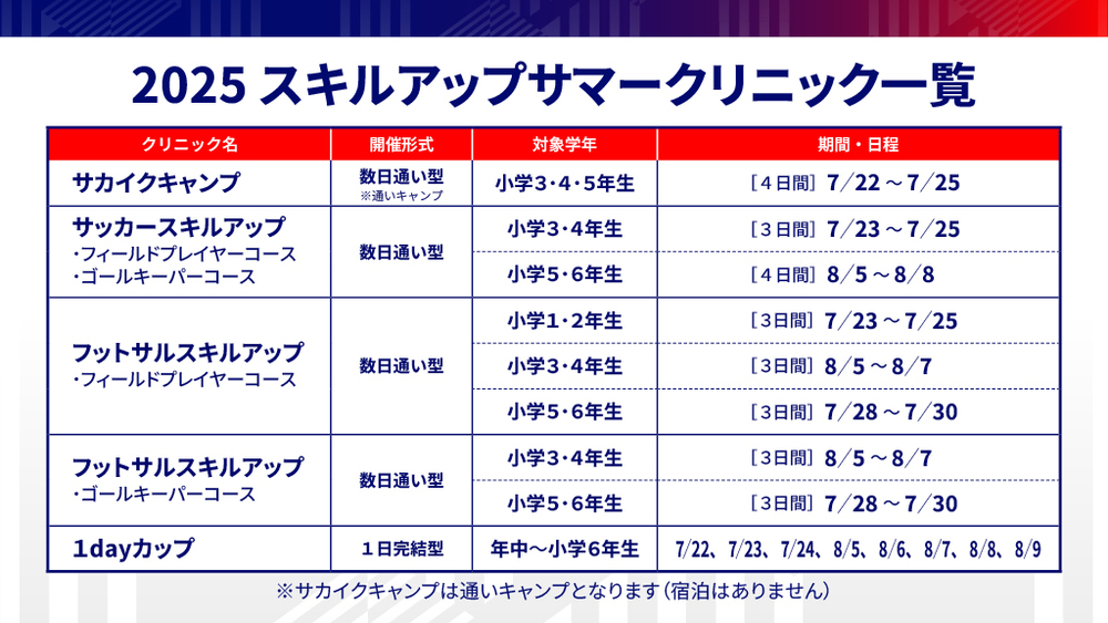 In den diesjährigen Sommerferien veranstaltet FC Tokyo eine Skill-Up-Sommerklinik für Grundschulkinder, die „ihre Fähigkeiten verbessern und auf einem höheren Niveau spielen möchten“.