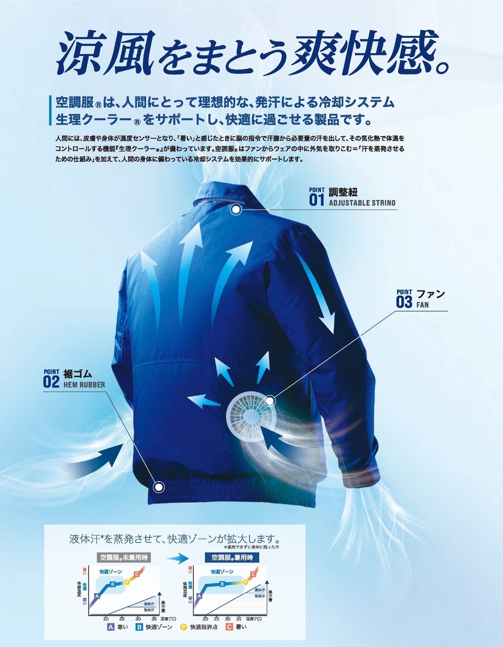 ※Das angebotene Produkt verwendet Patente und Technologien der Seft Laboratory Co., Ltd. und Air Conditioning Clothing Co., Ltd. „空調服“ (Kūchōfuku) ist eine Marke für fanbetriebene Kleidung, deren Zubehör und die damit verbundenen Marken der genannten Unternehmen. Die Logos „空調服“, „生理クーラー“ und „DC空調服“ sind eingetragene Warenzeichen der Seft Laboratory Co., Ltd. und Air Conditioning Clothing Co., Ltd.