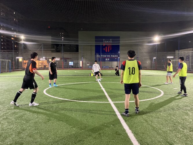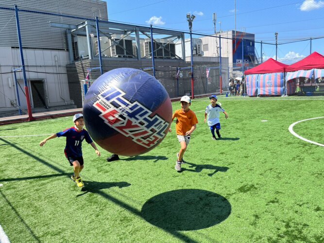 Zur Veranstaltungszeit erfolgt die Anmeldung am Eingang des B-Platzes im FC Tokyo Park Fuchu. Die versammelten Teilnehmer spielen ein Fußballspiel mit dem riesigen Ball.