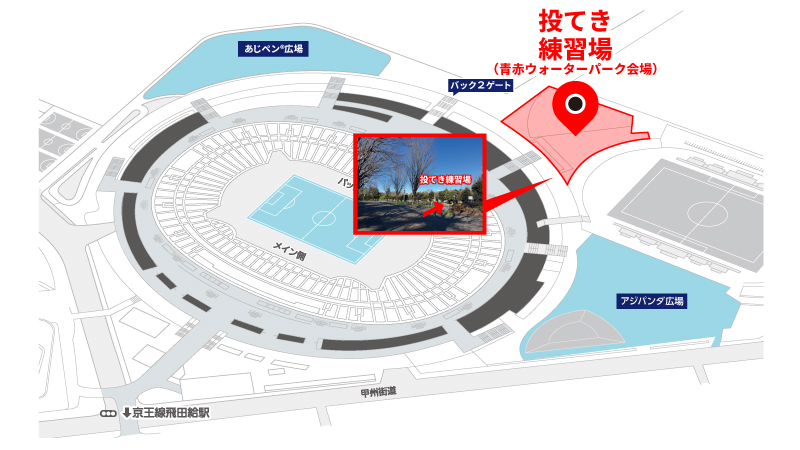 * Das Wurftrainingsgelände im Ajinomoto Stadium kann vor dem Einlass (vor Öffnung der Tore) genutzt werden. Nach dem Einlass ist die Nutzung auch über das Wiedereinlass-Tor möglich.