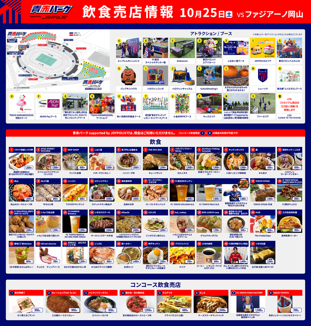 Sa., 25.10.2025, 35. Spieltag der Meiji Yasuda J1 League vs Fagiano Okayama (Anpfiff 14:00 / Ajinomoto Stadium): Informationen zu Speisen und Getränken, die im AO-AKA PARK supported by JOYPOLIS (außerhalb des Stadions), im mobilen AO-AKA PARK supported by JOYPOLIS sowie an den Verkaufsständen im Innenbereich des Stadions (Konzessionsgänge) angeboten werden.