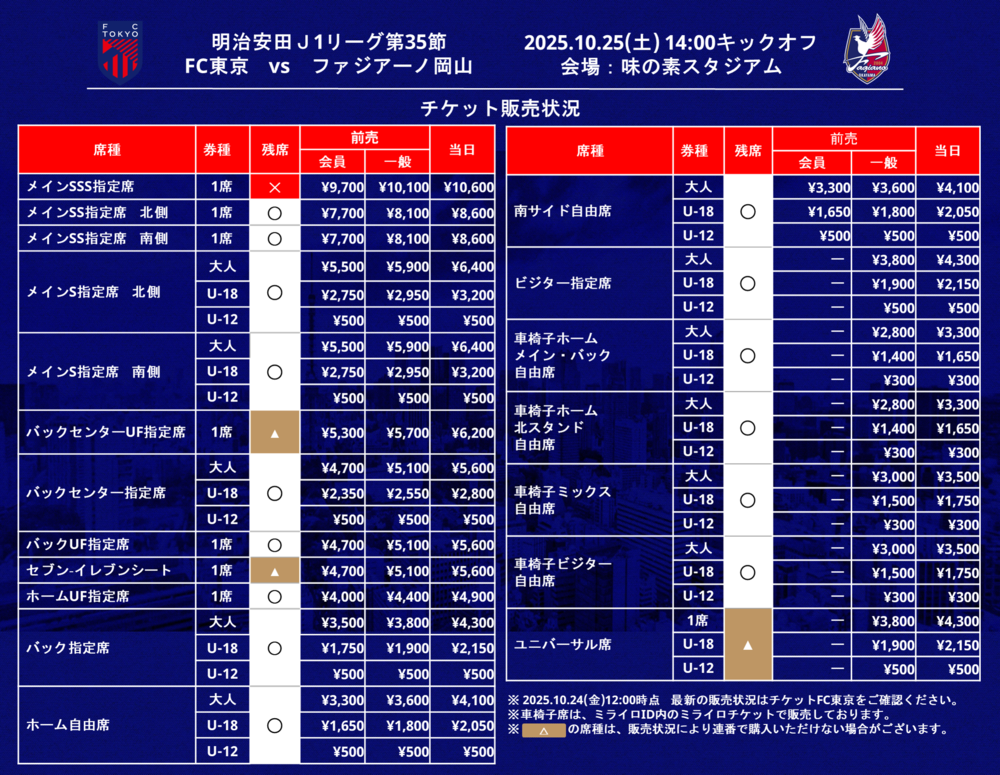 Zum Verkauf von Tageskarten für das Spiel der 35. Runde der Meiji Yasuda J1 League 2025 FC Tokyo vs Fagiano Okayama (Anpfiff 14:00 / Ajinomoto Stadium) informieren wir Sie wie folgt.