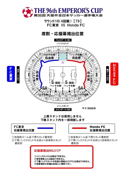 Die Fußballvereinigung Tokio, die den Spielbetrieb für die 16. Runde (4. Runde) des 96. Emperor's Cup All-Japan Fußballmeisterschaftsspiels FC Tokyo gegen Honda FC übernimmt, hat uns die folgenden Informationen bezüglich der Öffnungszeiten der Tore am Spieltag, der genutzten Tribünen, der Unterstützungsbanner und der Zuschauerregeln mitgeteilt, die wir hiermit bekannt geben.