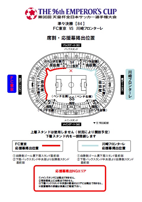 Die Fußballvereinigung von Tokio, die den Spielbetrieb für das Viertelfinale des 96. Emperor's Cup All Japan Soccer Championship zwischen FC Tokyo und Kawasaki Frontale übernimmt, hat uns bezüglich der Öffnungszeiten am Spieltag, der genutzten Tribünen, der Unterstützungsbanner und der Zuschauerregeln wie folgt informiert, weshalb wir dies hiermit bekannt geben.