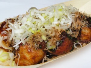 (8) Jumbo-Takoyaki mit viel Frühlingszwiebeln・・・700 Yen Große Takoyaki mit einem Durchmesser von ca. 5 cm, belegt mit süßlich schmeckenden Frühlingszwiebeln als Topping. |