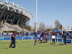 Ein Trainer der FC Tokyo Promotion Department spielt auf dem Air-Pitch zusammen mit allen, die am Tag selbst kommen, Mini-Fußball!