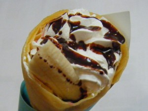 Crepe mit Schoko-Bananen-Creme・・・400 Yen Fluffiger Teig, gefüllt mit reichlich, nur leicht gesüßter Creme |