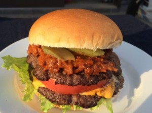 Double Chili Burger・・・750 Yen Ein neues, sättigendes Menü mit zwei 100 % Rindfleisch-Patties, frischem Gemüse und Chili dazwischen! |