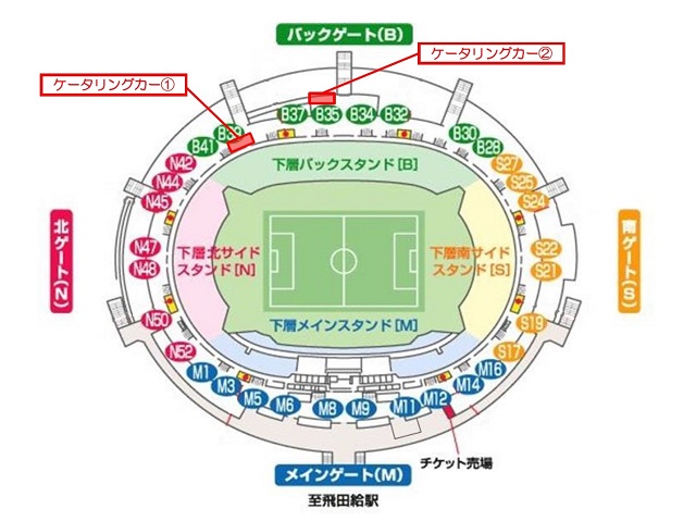 Wenn bis zum Mittag des Tages vor dem Spiel basierend auf Wettervorhersagen und anderen Informationen ein „Regentag“ festgestellt wird, wird die Durchführung der Serviceleistungen auf der Homepage des Ajinomoto Stadiums sowie auf dieser Homepage bekannt gegeben.