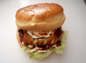 (6) Sasebo-Burger・・・700 Yen Der Sasebo-Burger, ein typisches B-Class Gourmetgericht aus Kyushu, ist besonders sättigend. |