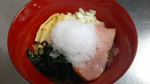 (4) Sommer-Tama-Ramen・・・・700 Yen Wir haben das Tama-Ramen, das den Sake "Tama Jiman" aus Fussa in der Sauce verwendet, für den Sommer neu arrangiert und mit Eis bedeckt, um es gekühlt zu servieren. |