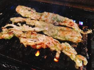 (2) Basilikum-Halsfleisch ... 600 Yen Bitte probieren Sie das Hähnchenhalsfleisch, das in Basilikumsoße mariniert und gegrillt wurde. Als geheime Zutat wird das Tokyo E-Mark "Hamane Salz" verwendet. |