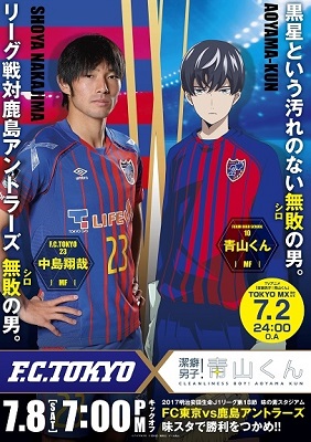 FC Tokyo freut sich, bekannt zu geben, dass im Rahmen des 18. Spieltags der Meiji Yasuda J1 League 2017 gegen die Kashima Antlers eine gemeinsame Promotion mit dem TV-Anime „Keppeki Danshi! Aoyama-kun“ durchgeführt wird, dessen Originalserie derzeit sehr beliebt in der Shueisha-Publikation „Weekly Young Jump“ läuft und der ab dem 02.07. (So) auf TOKYO MX und weiteren Sendern ausgestrahlt wird. In Anlehnung an den Protagonisten Aoyama-kun, der „noch nie ein Spiel verloren hat“, wurde von FC Tokyo Shoya NAKAJIMA als visuelles Motiv ausgewählt, der in Ligaspielen gegen die Kashima Antlers ebenfalls „noch nie verloren hat“!