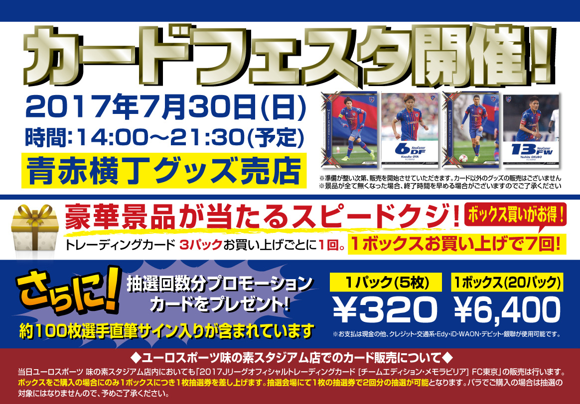 Am Veranstaltungstag werden im Eurosports-Shop im Ajinomoto Stadium ebenfalls die „2017 J-League Offiziellen Trading Cards [Team Edition Memorabilia] FC Tokyo“ verkauft. Beim Kauf einer Box erhalten Sie pro Box ein Los. Mit einem Los können Sie an der Verlosung im Sonderverkaufsstand im oben genannten Aoaka Yokocho zweimal teilnehmen. Einzelkäufe sind von der Verlosung ausgeschlossen, bitte haben Sie dafür Verständnis.
