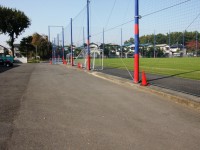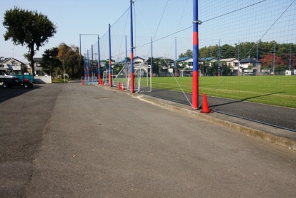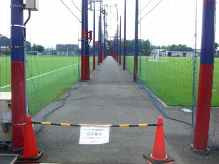 この通路を歩く際には必ず人工芝のグランド(練習しているグランド)寄りを歩いてください。ゴールの真裏を通過するため、強い威力のボールがネットに向かってたくさん飛んできます。ネットが緩んでいる箇所など、通行人にボールが当たってしまう恐れがありますので、十分注意して通過して下さい。また、絶対に立ち止まらないよう、ご協力の程、よろしくお願いいたします。