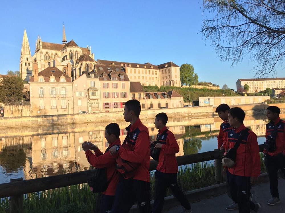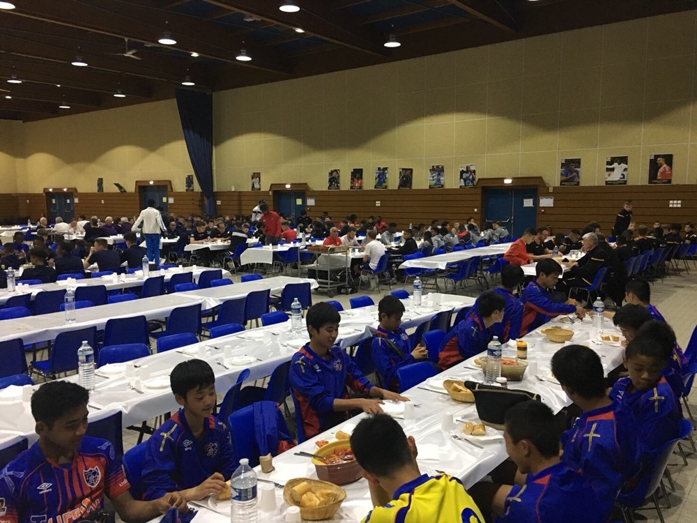 We had lunch at the same academy cafeteria as yesterday and then departed by bus for Sansu, where the tournament will be held. Before departure, we heard that the top team won against Hiroshima and took the lead, which further heightened the members' spirits.