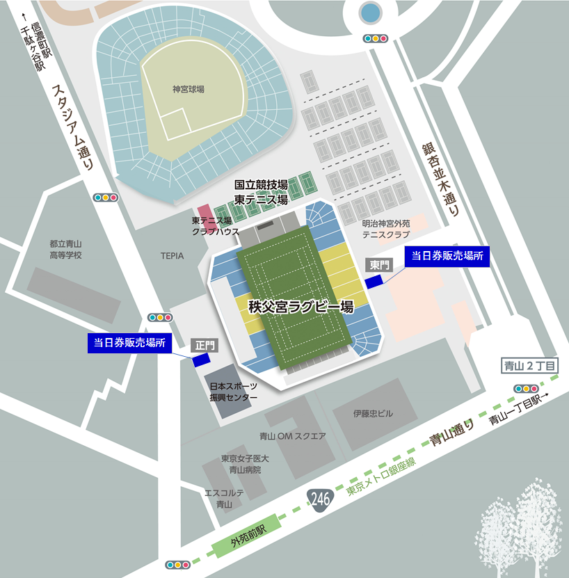 Chichibunomiya Rugby Stadium Ticket Sales Locations (Main Side: Near the Main Entrance/Gate / Back Side: Near the East Entrance/Gate)