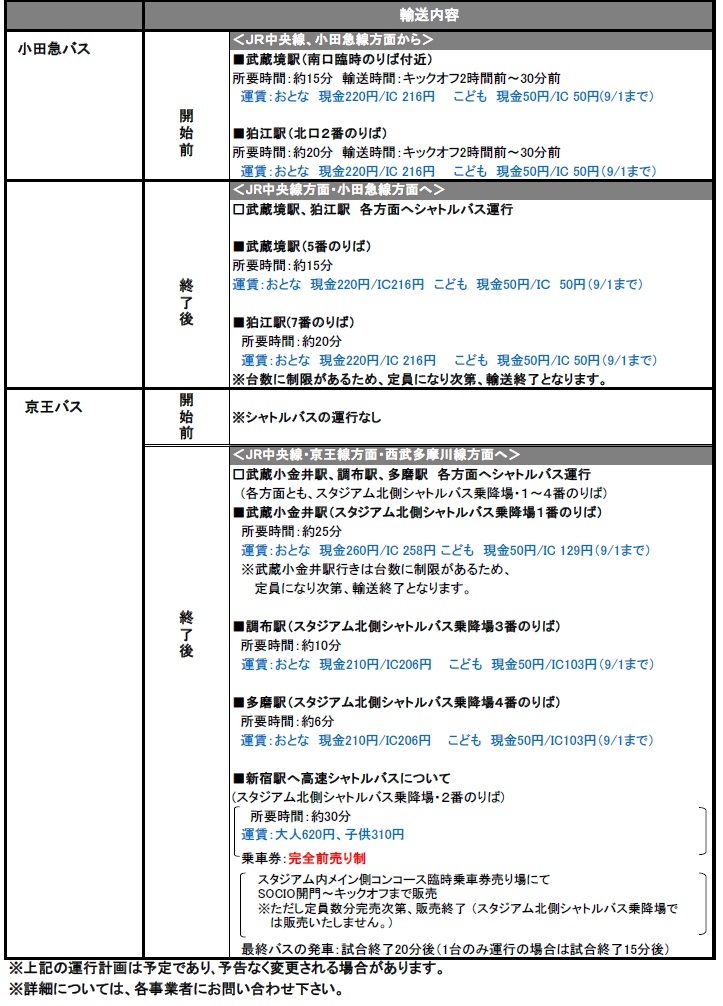 Information about shuttle buses and regular buses operating at the Meiji Yasuda Life J1 League Sec. 22 match between Vegalta Sendai (kickoff at 19:00) on Saturday, August 10, 2019 at Ajinomoto Stadium.