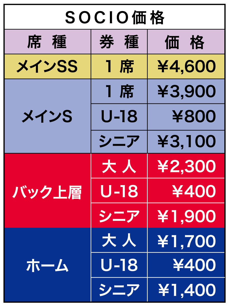 You can purchase tickets at a discounted price regardless of the seat type you have purchased. You can purchase up to 4 tickets per one SOCIO number for each match (For designated seat SOCIO members, advance sales are available, for general admission SOCIO members, advance sales, ticketing, and payment fees are free).