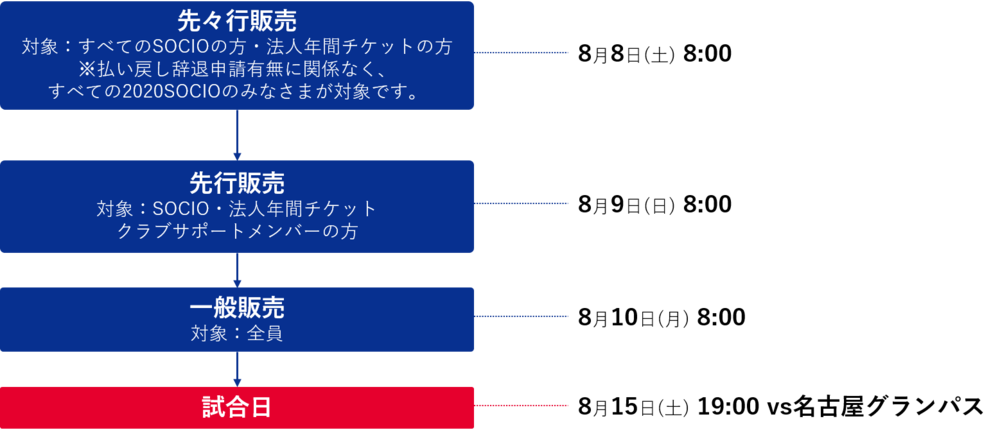 ・Ticket sales will start approximately one week before the match day. In addition, the sales start from 8:00 AM on the first day of SOCIO pre-sale, member pre-sale, and general sale respectively.