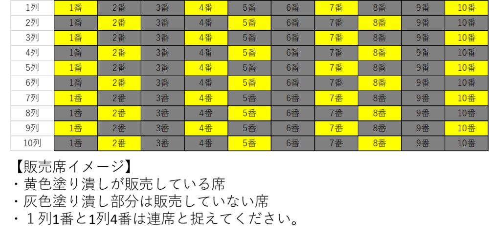 (Example) When you select two seats and get "Row 1 Seat 1 and Row 1 Seat 4", seats Row 2 Seat 2 and Seat 3 are not available for sale, so please consider them as consecutive seats.