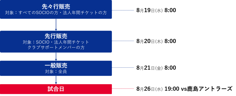 ・Ticket sales will start approximately one week before the match day. In addition, the sales start from 8:00 AM on the first day of SOCIO pre-sale, member pre-sale, and general sale respectively.
