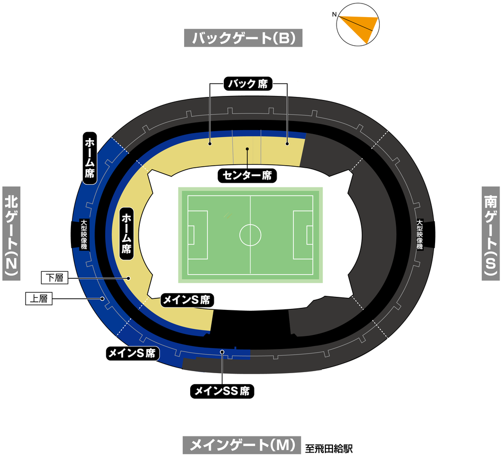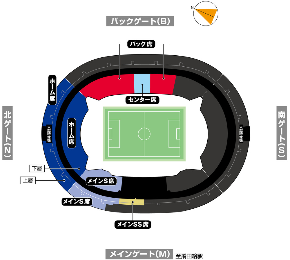 In any seat type or location, the seating distance is based on the J-League regulations, and there is a radius of 1m between the center of each seat and the center of the surrounding seats.