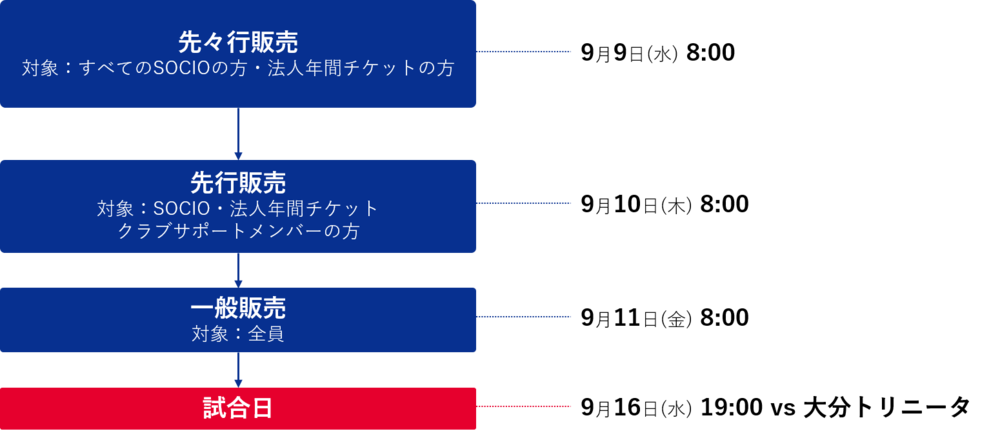 ・Ticket sales will start approximately one week before the match day. In addition, the sales start from 8:00 AM on the first day of SOCIO pre-sale, member pre-sale, and general sale respectively.