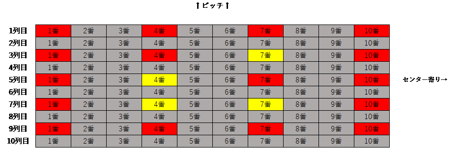 In the above case, if you choose automatic selection and purchase 2 tickets, it will be "vacant seats in rows 7 and 4, and rows 7 and 7 are adjacent seats". However, in the case of automatic selection, seats that are "close to the pitch" and "close to the center area" will be automatically selected, so "row 3, seat 4 and row 6, seat 2" will be selected.