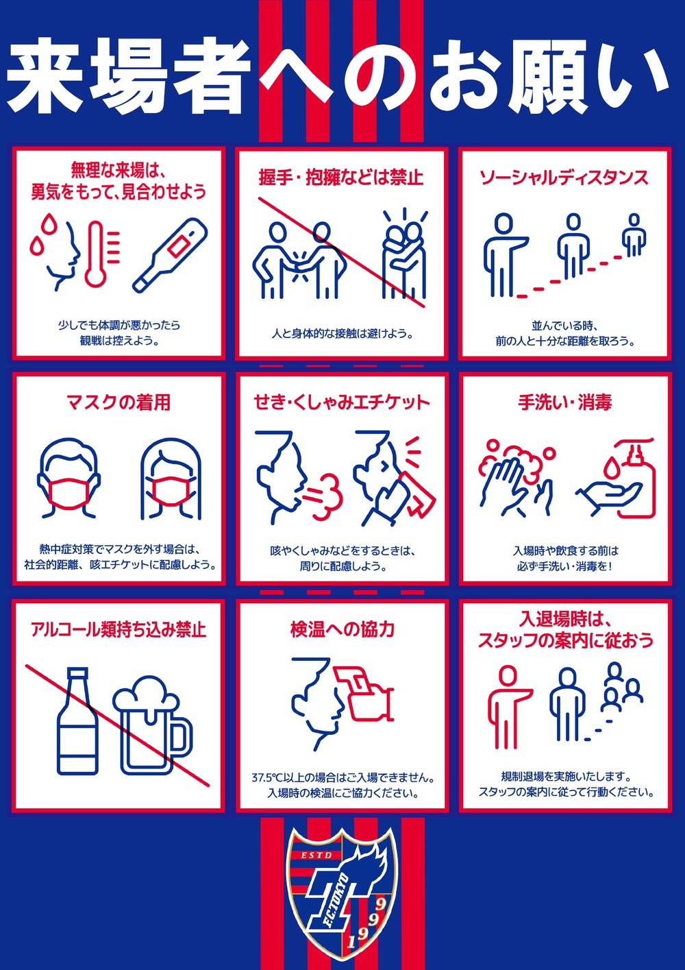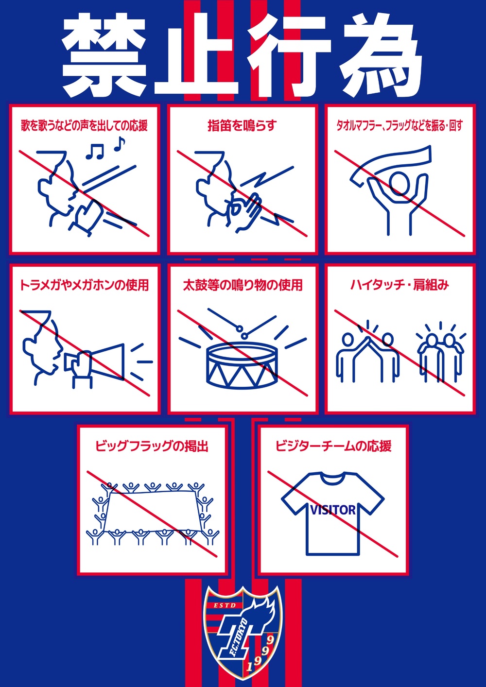 J League Unified Prohibition Rules (J League Common Spectator Etiquette & Rules) and FC Tokyo Soccer Match Management Regulations, as well as J League New Coronavirus Infection Control Guidelines, please comply with them.