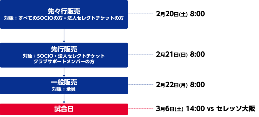 Application deadline: until 23:00 two days before the match Payment deadline: until 23:30 on the day after application Ticket issuance deadline: until 23:30 on the day after application. If exceeded, the reserved seat will become invalid.