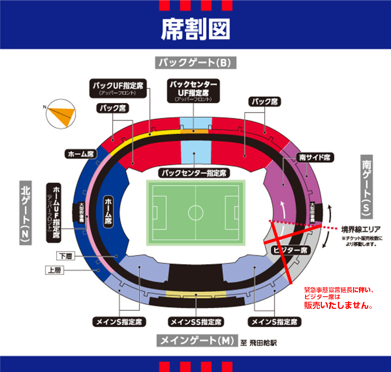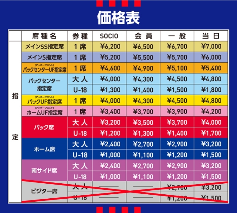 ※The price has been changed from the 5,000-person limit for matches held after the current state of emergency declaration (3/7).※Sales for visitor seats are scheduled to be available after the relaxation of restrictions has been confirmed.We do not sell tickets for the "Visitor Seats".