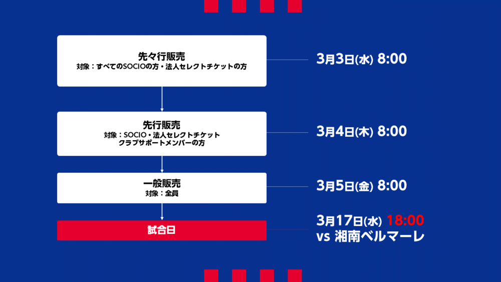Application deadline: until 23:00 two days before the match Payment deadline: until 23:30 on the day after application Ticket issuance deadline: until 23:30 on the day after application. If exceeded, the reserved seat will become invalid.