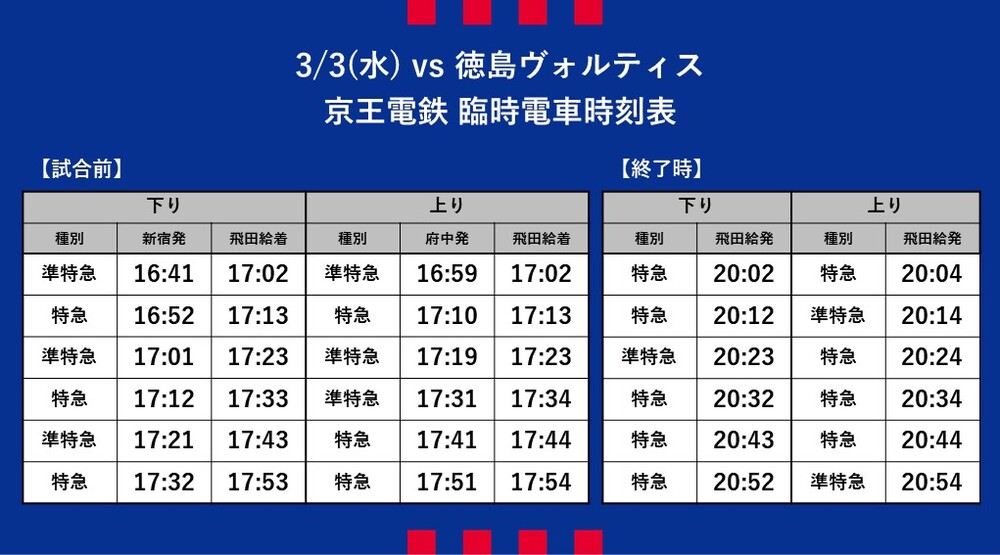 Temporary transportation access (railway) information for the 2021 J-League YBC Levain Cup Group Stage Match 1 vs Tokushima Vortis (18:00 Kickoff / Ajinomoto Stadium) to be operated on Mar 3 (Wed) will be provided.