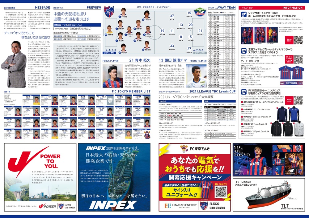 Regarding the official matchday program for the 2021 J.League YBC Levain Cup Group Stage Matchday 1 against Tokushima Vortis (Kickoff at 18:00/Ajinomoto Stadium) on 3/3 (Wednesday), we would like to provide the following information.