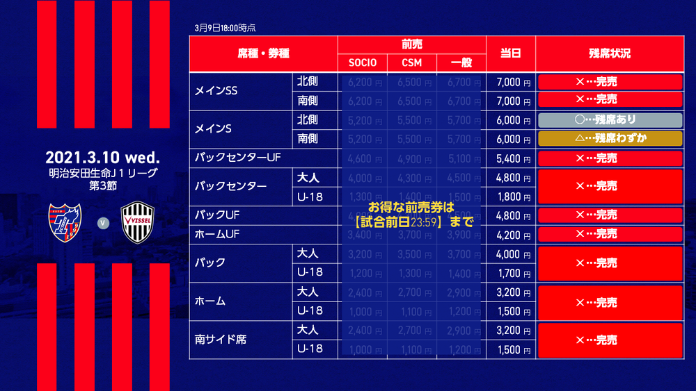 Announcement regarding the sale of same-day tickets for the 2021 Meiji Yasuda J1 League Matchday 3 between FC Tokyo and Vissel Kobe (19:00→18:00 Kickoff/Ajinomoto Stadium).