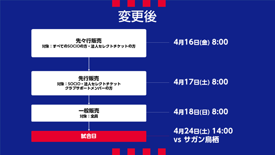 Regarding this match, based on the J.League's guidelines for dealing with the new coronavirus infection, it will be held after the period of measures has ended. However, at the time of the start of sales (4/10), it falls within the period of measures, so ticket sales will begin with a limit of 10,000 people. After the period of measures has ended, additional sales will be conducted.