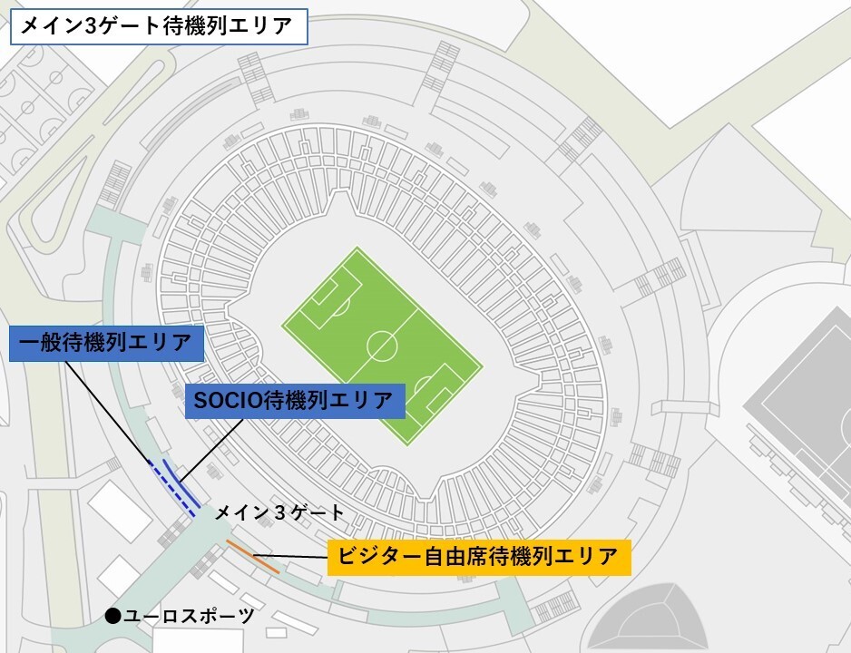 *For a certain period after the SOCIO gate opens, the types of seats that can be entered at each gate are restricted. Additionally, immediately after the gate opens, passage within the concourse is restricted, so crossing from the North Side Stand to the Back Stand is not possible. Those who enter early should check their seat type and the gate they can enter, and line up in the waiting area for entry.
