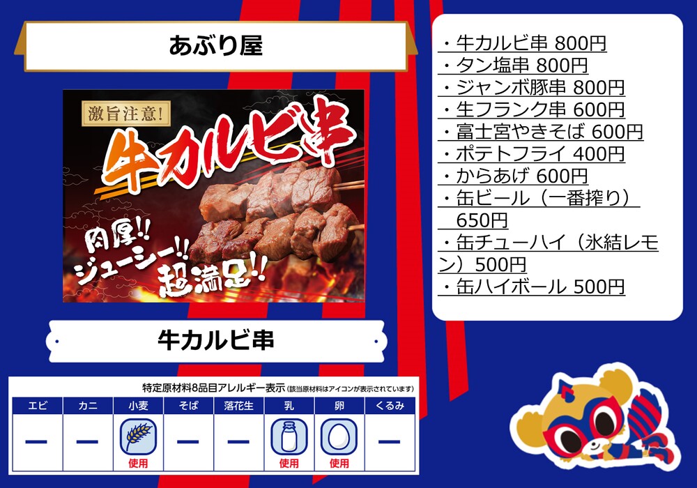 The food menu for the Gamba Osaka match on Oct 1 (Sun) at AO-AKA PARK supported by TOKYO GAS (outside the stadium) and the stadium concourse (inside the stadium) will be available for sale at the concession stands.