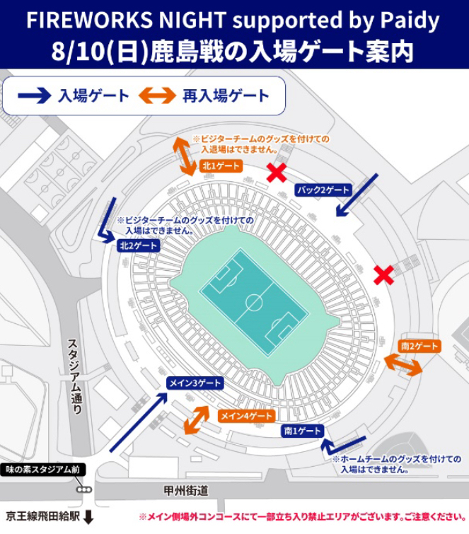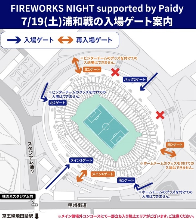 *For the matches on July 19 (Sat) against Urawa and August 10 (Sun) against Kashima, the re-entry gate locations will be operated in the same way; however, only for the Urawa match, the South Gate 2 will be exclusively for the visiting team.