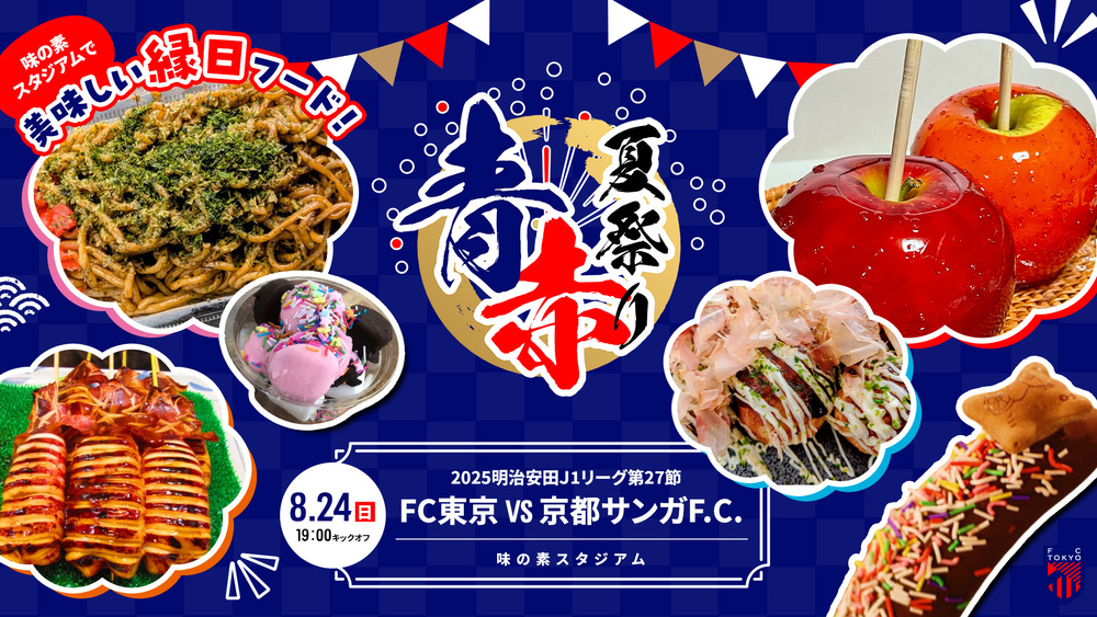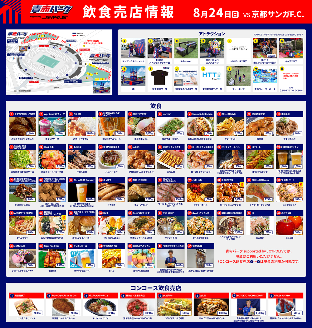 Sunday, August 24, 2025 Meiji Yasuda J1 League Sec. 27 Kyoto Sanga F.C. match (19:00 kickoff / Ajinomoto Stadium), AO-AKA PARK supported by JOYPOLIS (outside the venue), on-site!! Information on food and drinks sold at AO-AKA PARK supported by JOYPOLIS and the stadium concourse (inside the venue) shops will be announced.