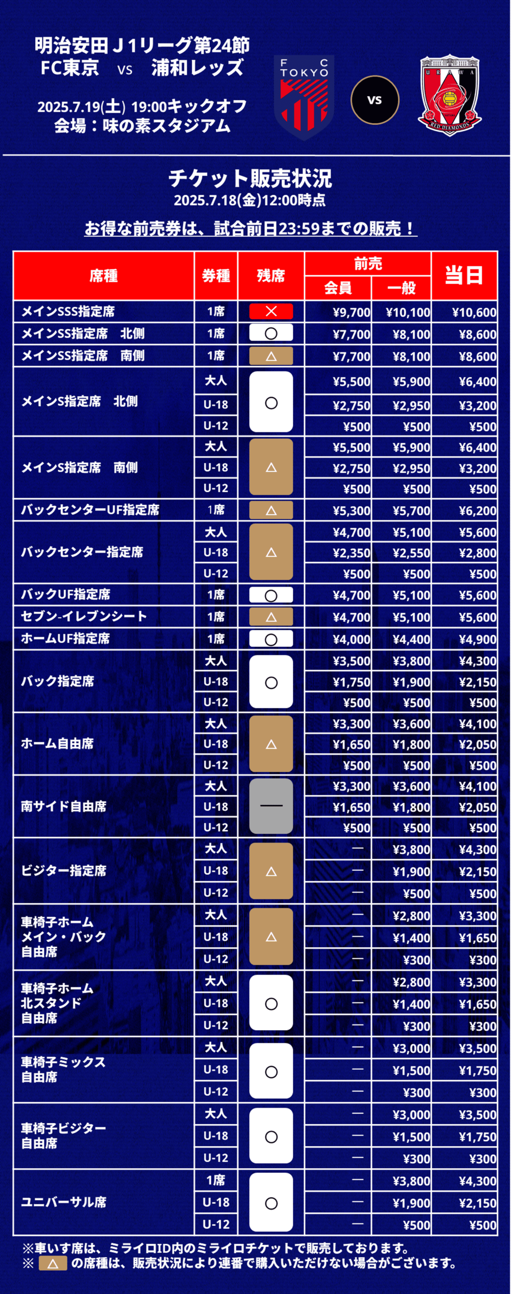 Regarding same-day ticket sales for the 2025 Meiji Yasuda J1 League Sec. 24 match FC Tokyo vs Urawa Reds (7:00 p.m. kickoff / Ajinomoto Stadium), we would like to inform you as follows.