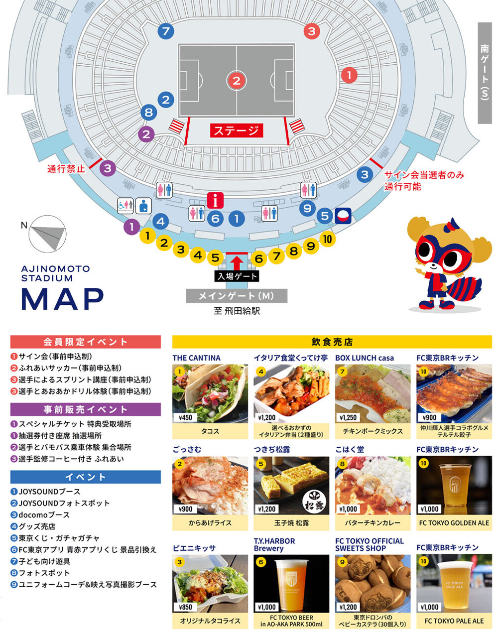 ・Please use the 'North Bicycle Parking' or the 'Under the Pedestrian Deck (next to Euro Sports Ajinomoto Stadium store)' bicycle parking areas.