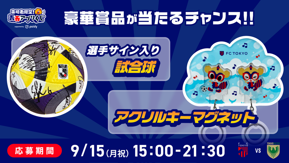 On September 15 (Mon, Public Holiday), 2025 Meiji Yasuda J1 League Sec. 29 vs Tokyo Verdy (7:00 p.m. kickoff / Ajinomoto Stadium), we will hold the 'Blue-Red App Lottery supported by Paidy' exclusive to attendees using the FC Tokyo official app.