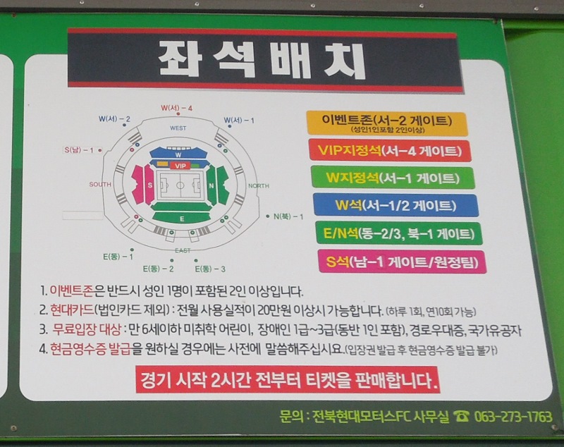 5) Sales location: Ticket boxes in the Main side (W), Back side (E), and Goal end (S) areas