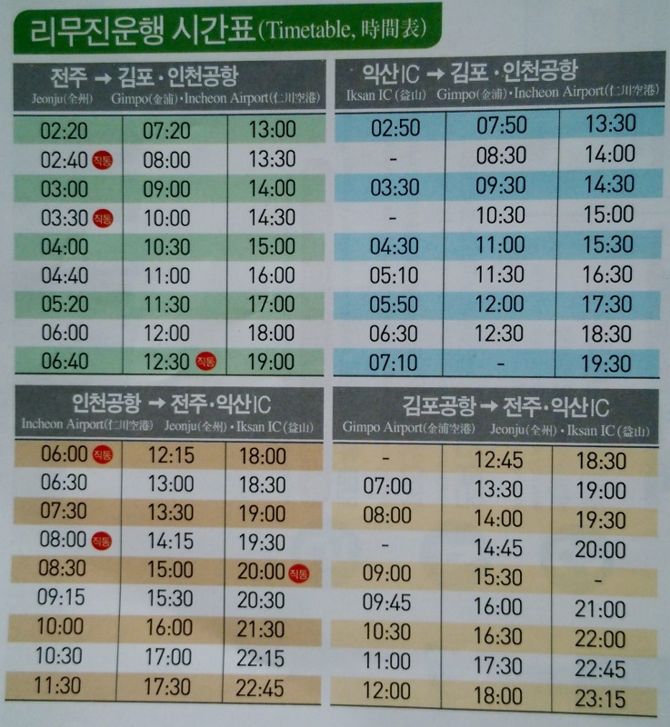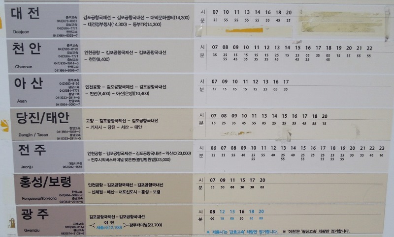 From Gimpo Airport to Airport Terminal (Jeonju): Departure from the 2nd boarding point on the 2nd floor of Gimpo Airport. The fare is 23,000 won and the travel time is 210 minutes.