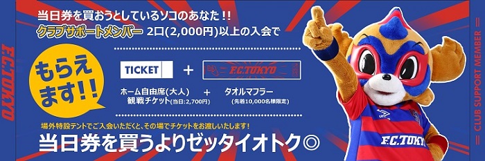 At the Kashima Antlers match on 10/22 (Sat), we will set up a club support member registration tent outside the stadium. If you join with 2 or more tickets (2,000 yen or more) at the special tent outside the venue, you can use the "Home Free Seat Ticket (on-the-day sale price (adult): 2,700 yen)" as a benefit from the day of registration. In addition, a towel scarf will be given to the first 10,000 people!